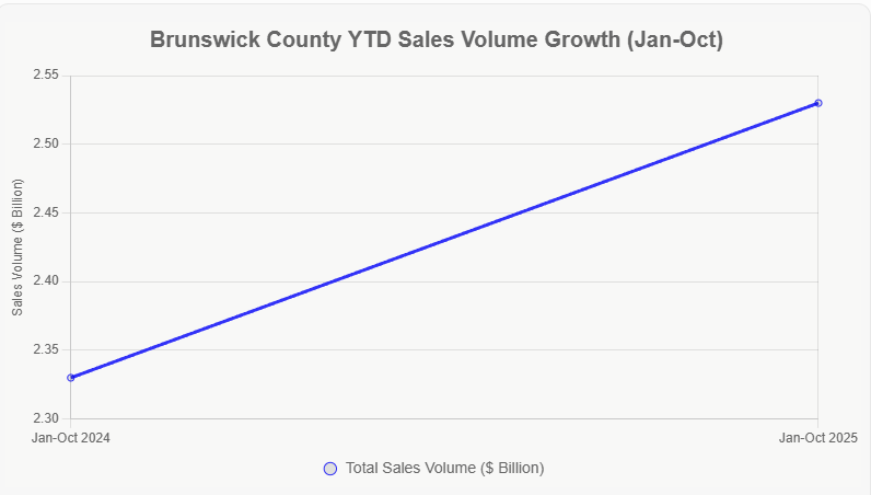 2025 was a year of stabilization and moderate growth in Brunswick County’s real estate market, following several years of rapid price escalation. The county saw a healthy balance return, with inventory levels remaining manageable and serious buyers taking advantage of slightly more options. Total residential sales volume through October 2025 reached $2,534,151,185, an 8.6% increase from the same period in 2024. Year-to-date (YTD) through late 2025, sales volume stood at approximately $2.91 billion, representing 5,883 closed units—a slight uptick from 5,729 units in 2024. This reflects ongoing demand driven by population growth (Brunswick County grew by about 5% in 2025, the fastest in North Carolina) and relocations from northern states.