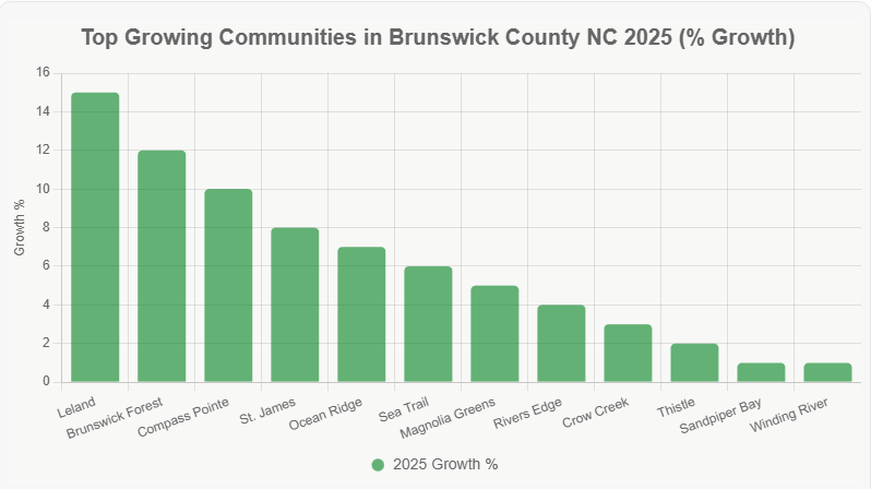 This chart highlights how northern areas like Leland dominated growth, while southern coastal communities held steady in value.